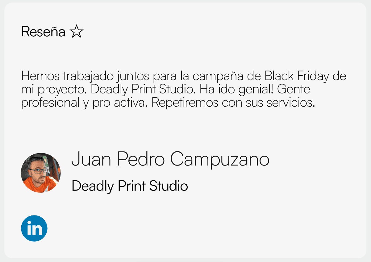 A pesar del poco margen de tiempo, la campaña de Black Friday logró resultados extraordinarios. Con una estrategia bien ejecutada y creatividades alineadas al público objetivo, Deadly Print Studio alcanzó su día de mayor facturación histórica y multiplicó sus ingresos, validando el potencial del canal de paid media como palanca de crecimiento.
